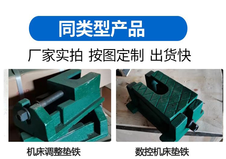 將調(diào)整墊鐵分別放在機(jī)床各受力點(diǎn)下,每個(gè)墊鐵均受力后,然后調(diào)整墊鐵。可調(diào)整高度為3mm--15mm 鑄鐵調(diào)整墊鐵調(diào)整方便,遷移靈活,不用打洞埋設(shè)地腳螺絲,不破壞地面,是機(jī)床設(shè)備安裝工藝的一大改革。能_同床動(dòng)態(tài)特性,提高機(jī)床加工精度,具有防震、降低噪音之功能。省工、省時(shí)、省材料、綜合經(jīng)濟(jì)益高。為設(shè)計(jì)部門(mén)解決了因設(shè)備選型困難,造成地面基礎(chǔ)無(wú)法確定的矛盾。通用性廣,適用安裝各類機(jī)床與設(shè)備。